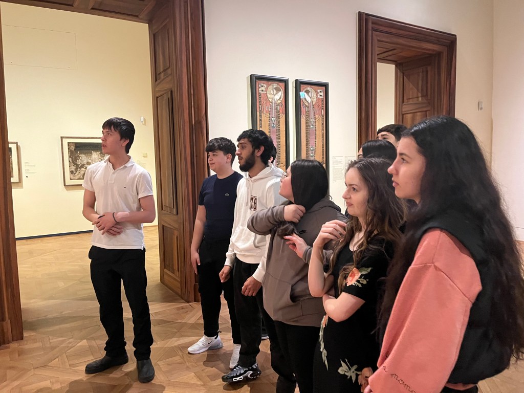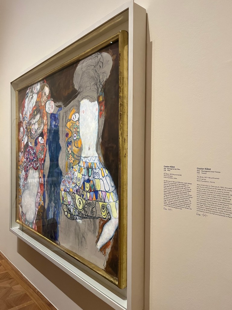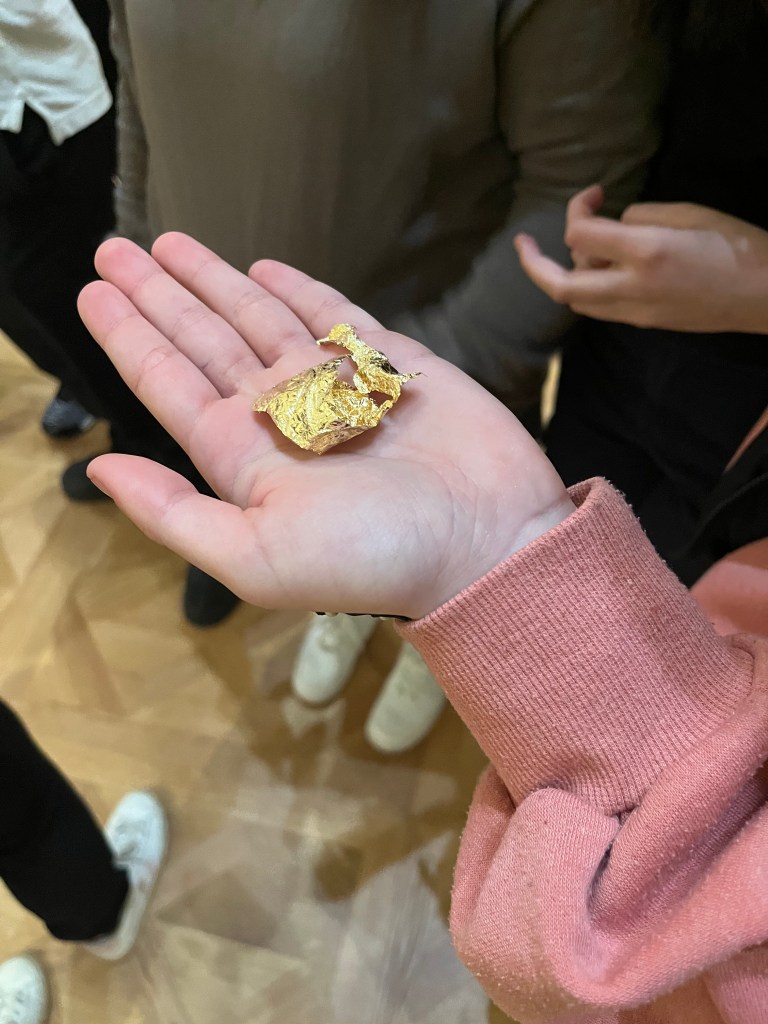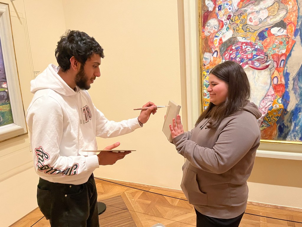 Die 4a besuchte die Ausstellung „Klimt. Inspired by Van Gogh, Rodin, Matisse…“ im Unteren Belvedere. Zunächst untersuchten wir Bilder Klimts auf typische Merkmale wie Goldtöne und Muster. Danach verglichen wir sie mit seinen Vorbildern. Wir lernten in der Führung verschiedene Zeichenstile kennen und waren beeindruckt von der Vielfalt der Werke. Ein unfertiges Bild (Klimt starb vor der Fertigstellung) rundete die Führung ab.
