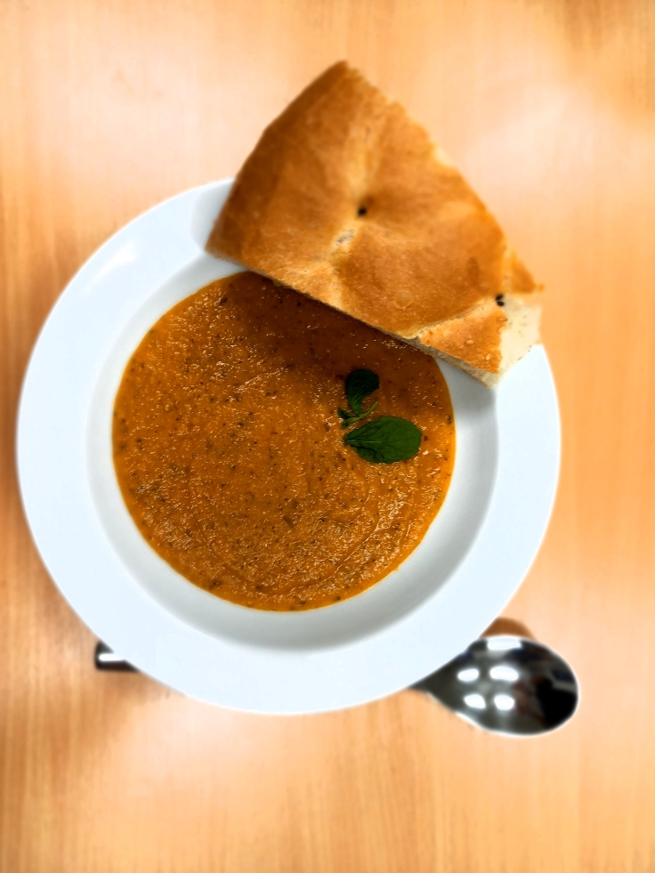 Die Suppe wird mit einem Minzeblatt dekoriert und mit einem Stück Fladenbrot serviert.